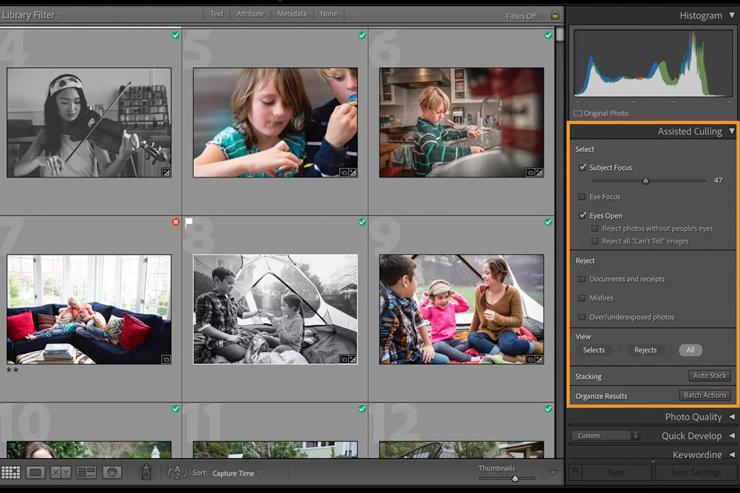 Med Assisted Culling kan du nå raskt kategorisere portretter basert på om fokuset er på personen eller øyet, om øynene er åpne eller lukkede og så videre. På samme måte som med autostacking kan du gruppere bilder etter blant annet visuell likhet og tidspunkt for opptak. Programmet sorterer bildene selv etter de valgte parametrene.