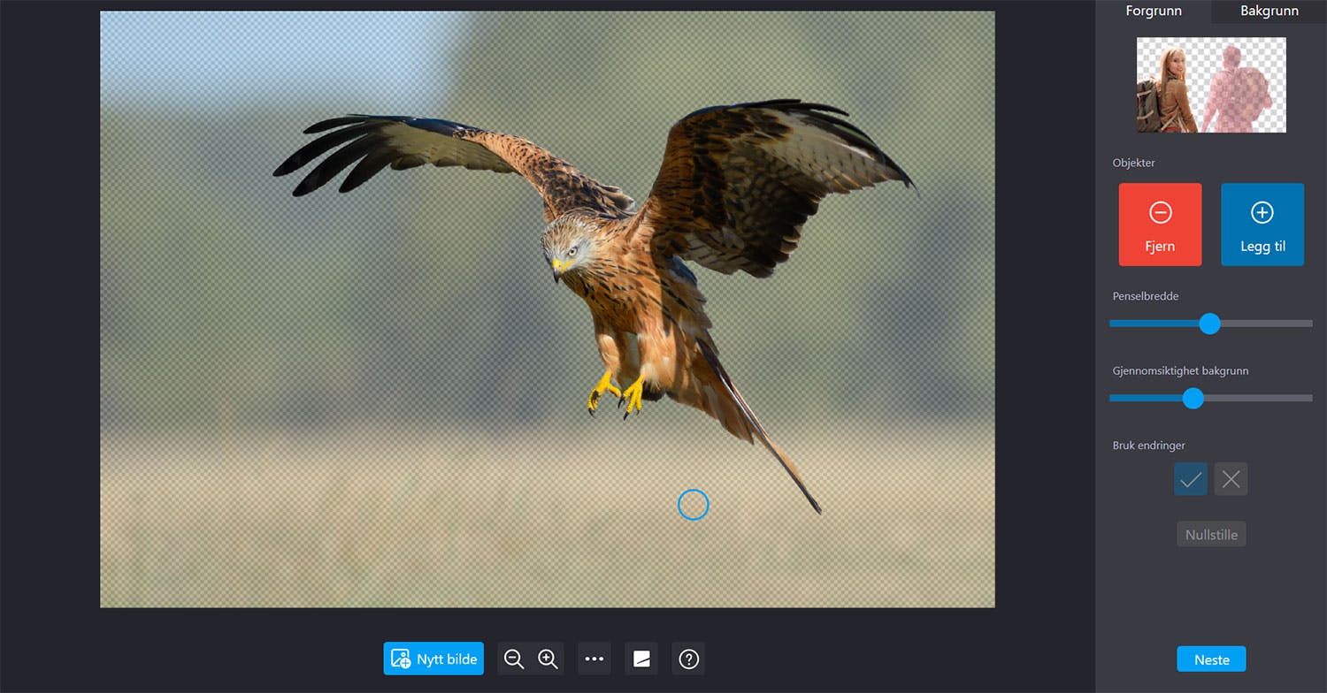 I det neste bildet kan du velge om bildet bare skal ha en gjennomsiktig bakgrunn, eller om du vil sette inn en ny bakgrunn.