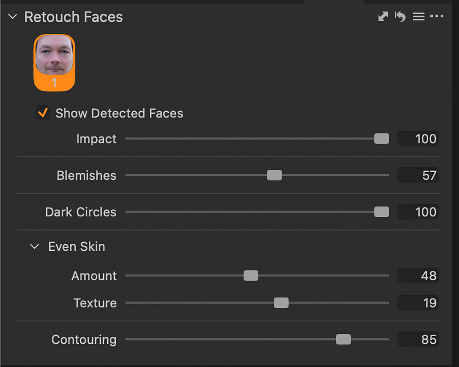 Det er enkelt å foreta effektiv, men diskré retusjering som ser veldig naturlig ut. I Retouch-modulen finnes det automatiserte funksjoner for å fjerne ujevnheter, mørke ringer, glatte ut huden og stramme opp ansiktsfasongen.