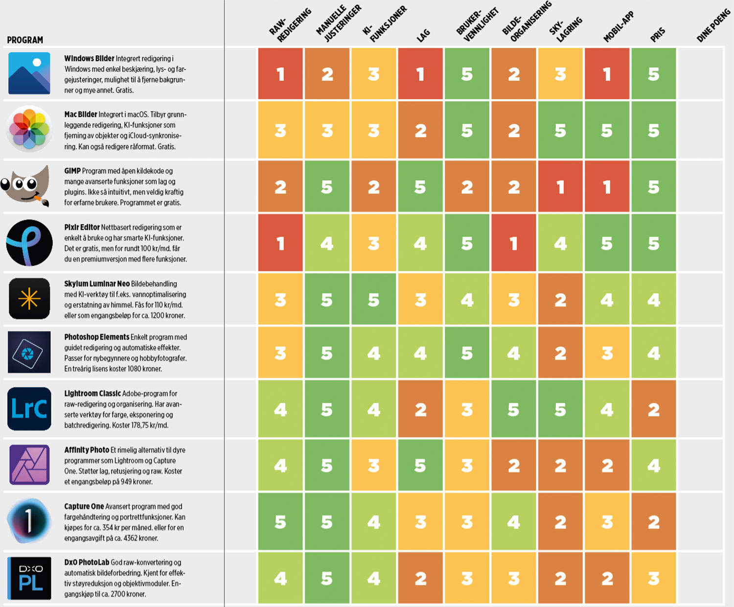 Det er stor forskjell på prisene og mulighetene i bildebehandlingsprogrammene, og kanskje er det på tide å bytte. Vi har kjørt bildene våre gjennom ti av de mest interessante programmene og samlet erfaringene våre for å hjelpe deg med å velge det som passer aller best for nettopp deg.