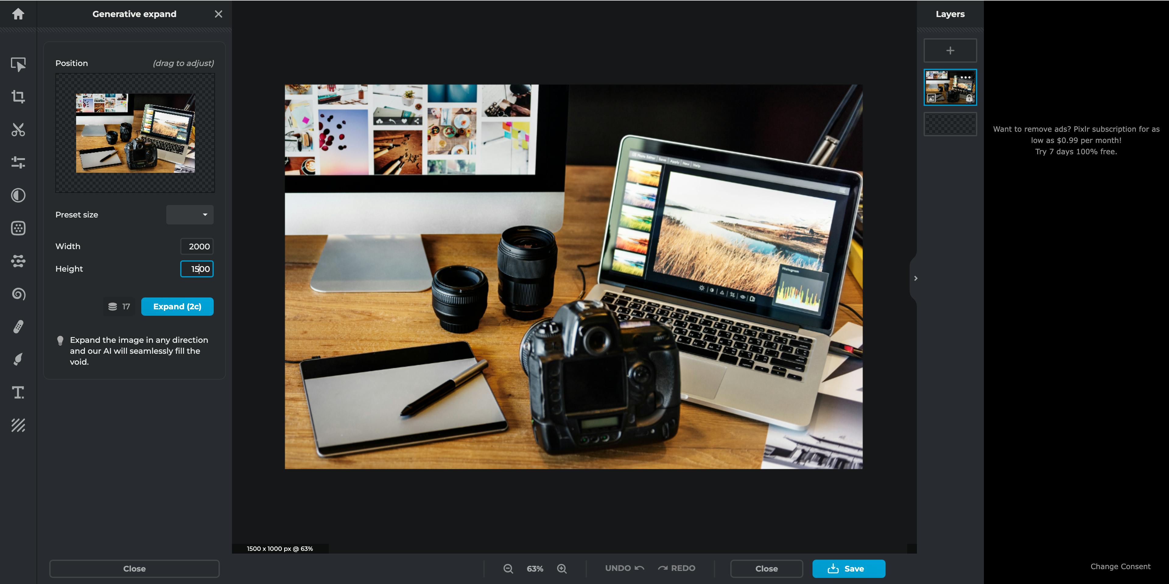 Programmet Pixlr tilbyr en lang rekke KI-baserte funksjoner til bilderedigering. Mange av dem er de samme som du er vant til fra Photoshop.