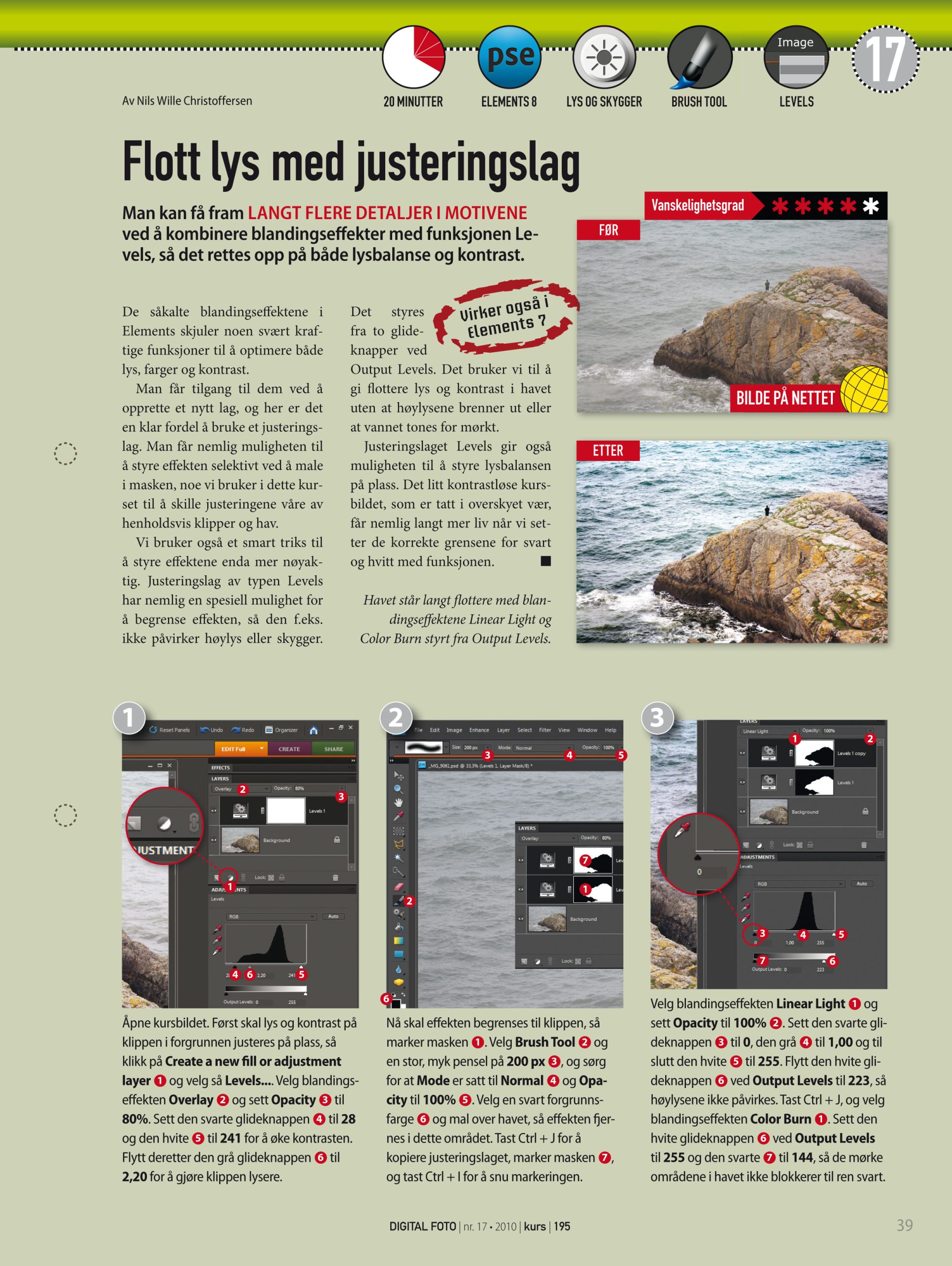Man kan få fram langt flere detaljer i motivene ved å kombinere blandingseff ekter med funksjonen Levels, så det rettes opp på både lysbalanse og kontrast.