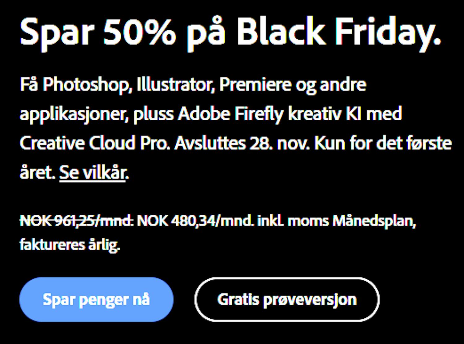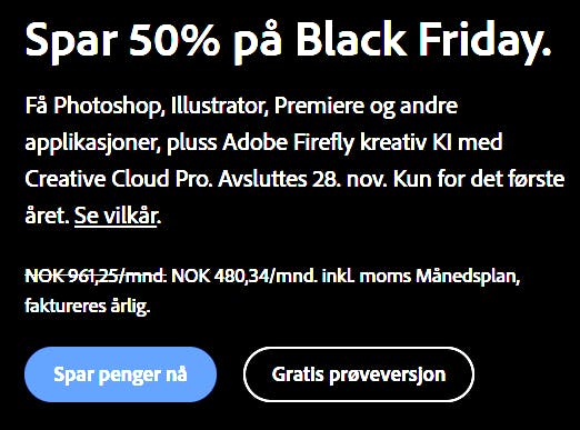 Creative Cloud Pro, som inkluderer Photoshop, Lightroom og Premiere Pro, koster vanligvis 961,25 kr per måned når du velger et årsabonnement. Under Black Friday er prisen redusert til 480,34 kroner. Se mer her.