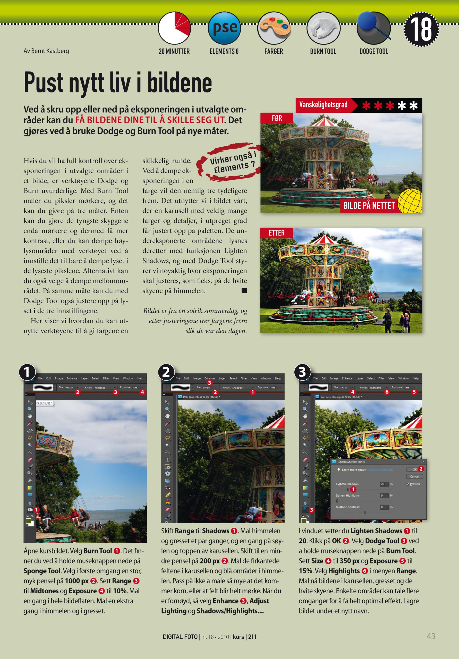 Bildebehandling Pust nytt ... Pust nytt liv i bildene Ved å skru opp eller ned på eksponeringen i utvalgte områder kan du få bildene dine til å skille seg ut. Tekst — Redaksjonen - 6. desember 2010 Lagre artikkel Du skal være logget ind for at gemme artikler. You need to login, before saving articles Kurs