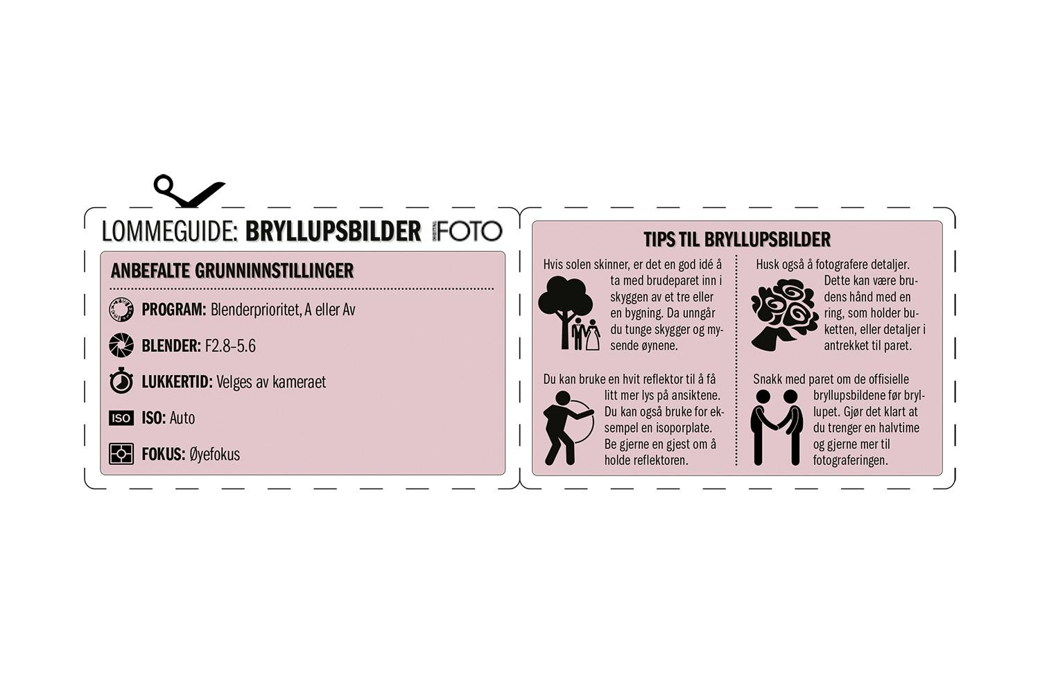 Her får du våre anbefalte grunninnstillinger og tips til både forberedelser til og fotografering av bryllup.