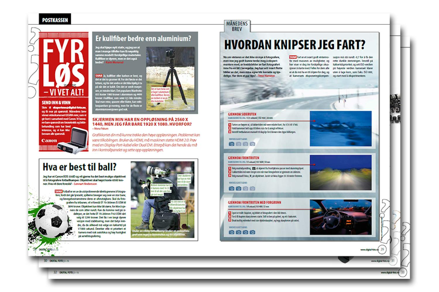 Vinteren kan ha en del grå dager, men ta en tur i bilen med sjåfør og ta noen praktfulle landskapsbilder i den blå timen, og få massevis av drama ved å få med farten på bildene dine. Her må du ha orden på stativer og lukkertider, samt lysmålingen og en rekke andre triks. Man må bruke forskjellige teknikker, alt etter om du fotograferer ut av sideruten eller frontruten. Hvordan du gjør det, får du svar på i månedens postkasse sammen med et lang rekke andre spørsmål.