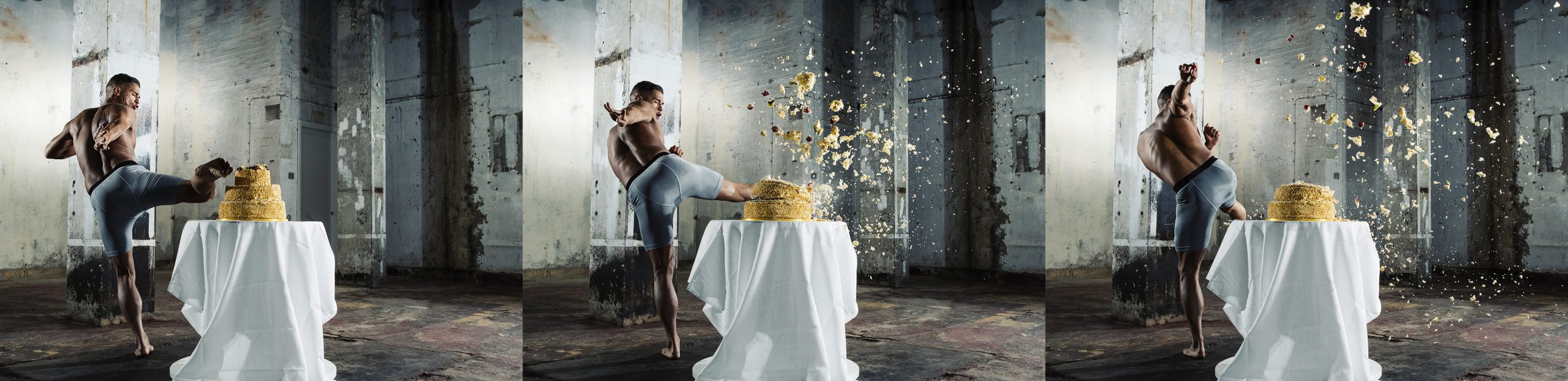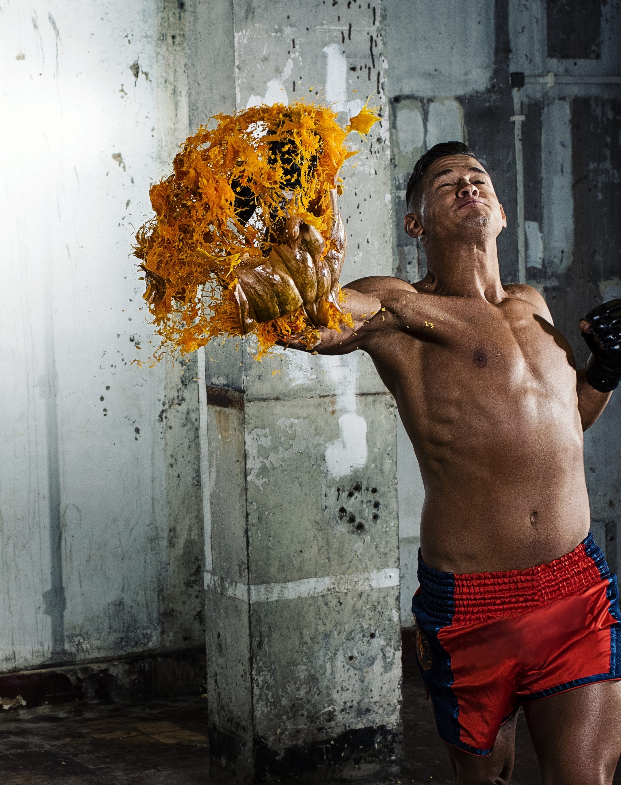 Den engelske sports-og portrettfotografen Tom Miles har tatt en bildeserie med kampsportsstjernen Tom ”Fire Kid” Duquesnoy, som er verdensmester i MMA (mixed martial arts), hvor han med høy hastighet og presisjon knuser f.eks. vanmmeloner, gresskar og småkaker med slag og spark.
