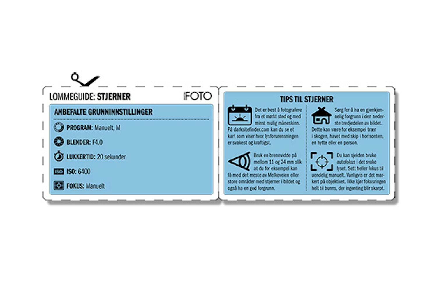 I denne lommeguiden får du våre anbefalte kamerainnstillinger til bilder av stjernehimmelen. Vi viser hvilket program du bør velge og hvilken blenderåpning, lukkertid og annet du kan ta utgangspunkt i og etterjustere ut fra.