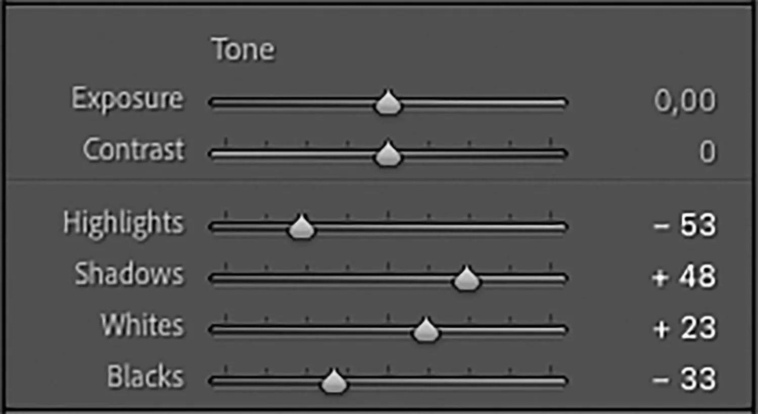 Demp Highlights for å få frem detaljer i de lyse partiene, og demp Blacks og forsterk Whites for å få sterkere kontrast mellom de veldig lyse og veldig mørke delene av bildet. Hvis du har en forgrunn, kan du forsterke Shadows for å få detaljene i forgrunnen til å komme tydeligere frem.