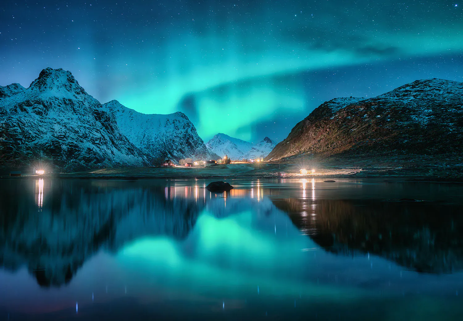 Hvis det er stille vann i omgivelsene foran deg, kan du prøve med en speiling. Komponer slik at horisonten er i midten. Dette kan skape god symmetri, slik at nordlyset gjengis nesten like mye i øvre og nedre del av bildet. Den lange lukkertiden myker opp vannet, slik at du får en fin og jevn speiling.