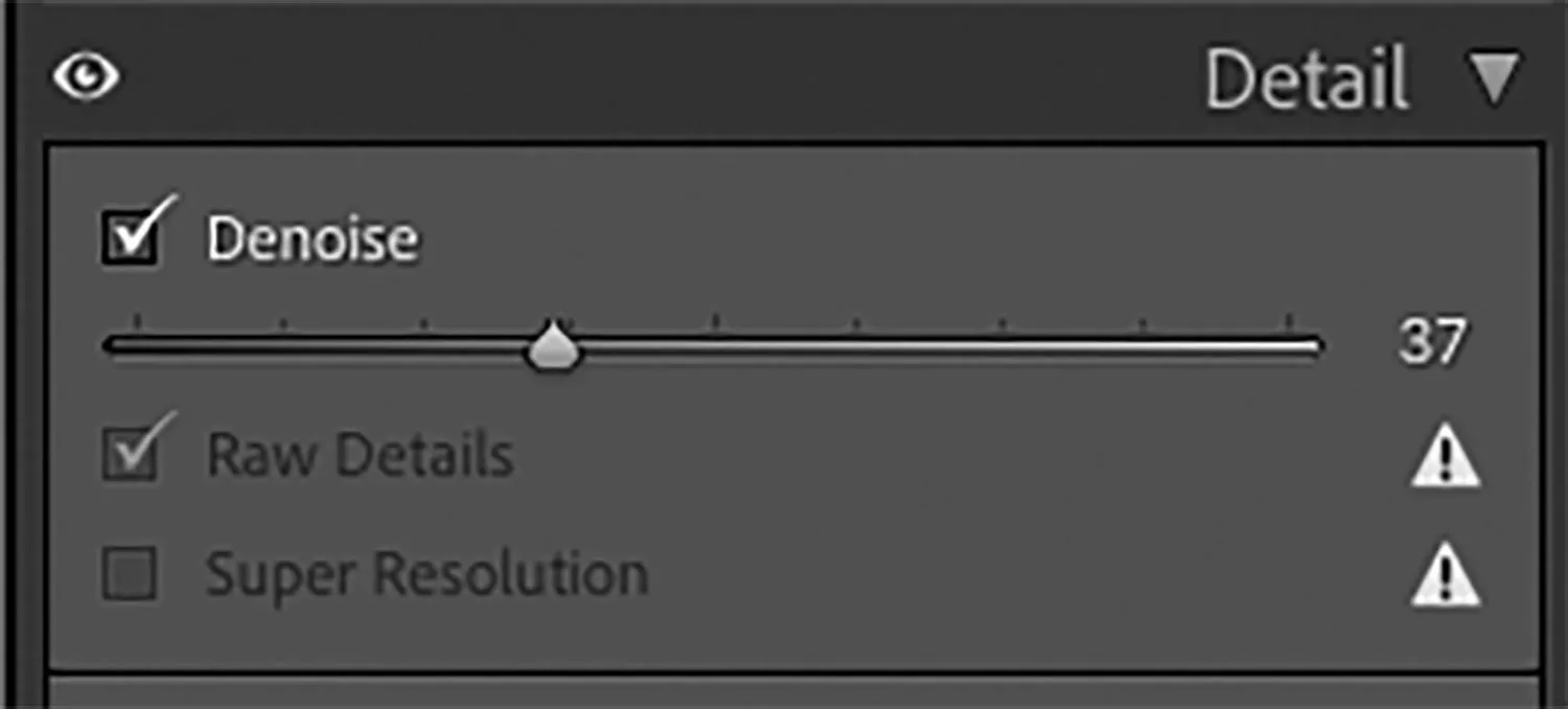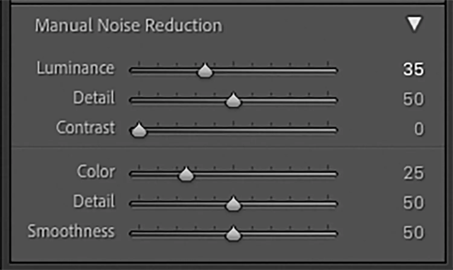 Manuell støyreduksjon gir deg de mest subtile resultatene, så begynn med det, og dra Luminans opp til maks. 50. Hvis det er mye støy, kan du bruke KI-baserte Denoise satt til mellom 30 og 50 prosent.