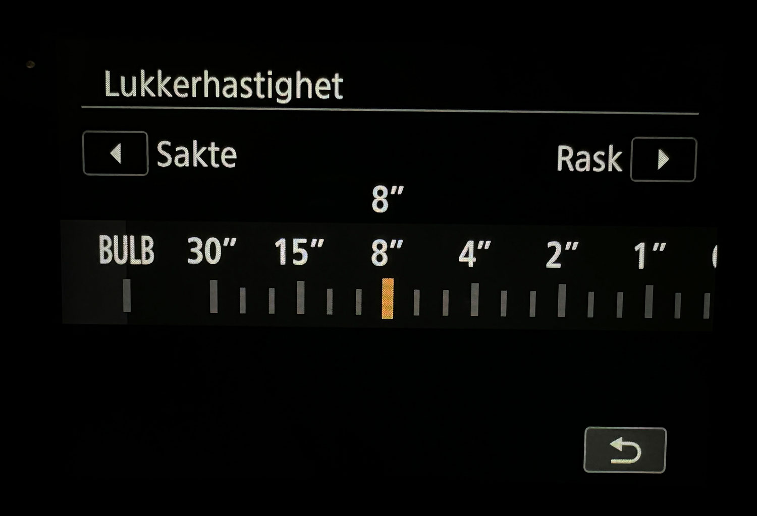 Velg manuelt program, og start med en lukkertid på åtte sekunder. Hvis nordlyset ikke er tydelig nok i bildet, øker du lukkertiden. Hvis stjernene er uskarpe, reduserer du lukkertiden til de ser skarpe ut på himmelen.