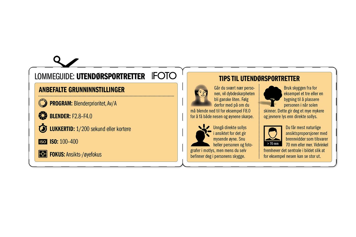 Her får du vår smarte lommeguide til utendørsportretter. I guiden kan du se våre anbefalte kamerainnstillinger, som du kan bruke som utgangspunkt når du skal fotografere personer. Og så får du en rekke tips til blant annet lysforhold som bidrar til flotte resultater.