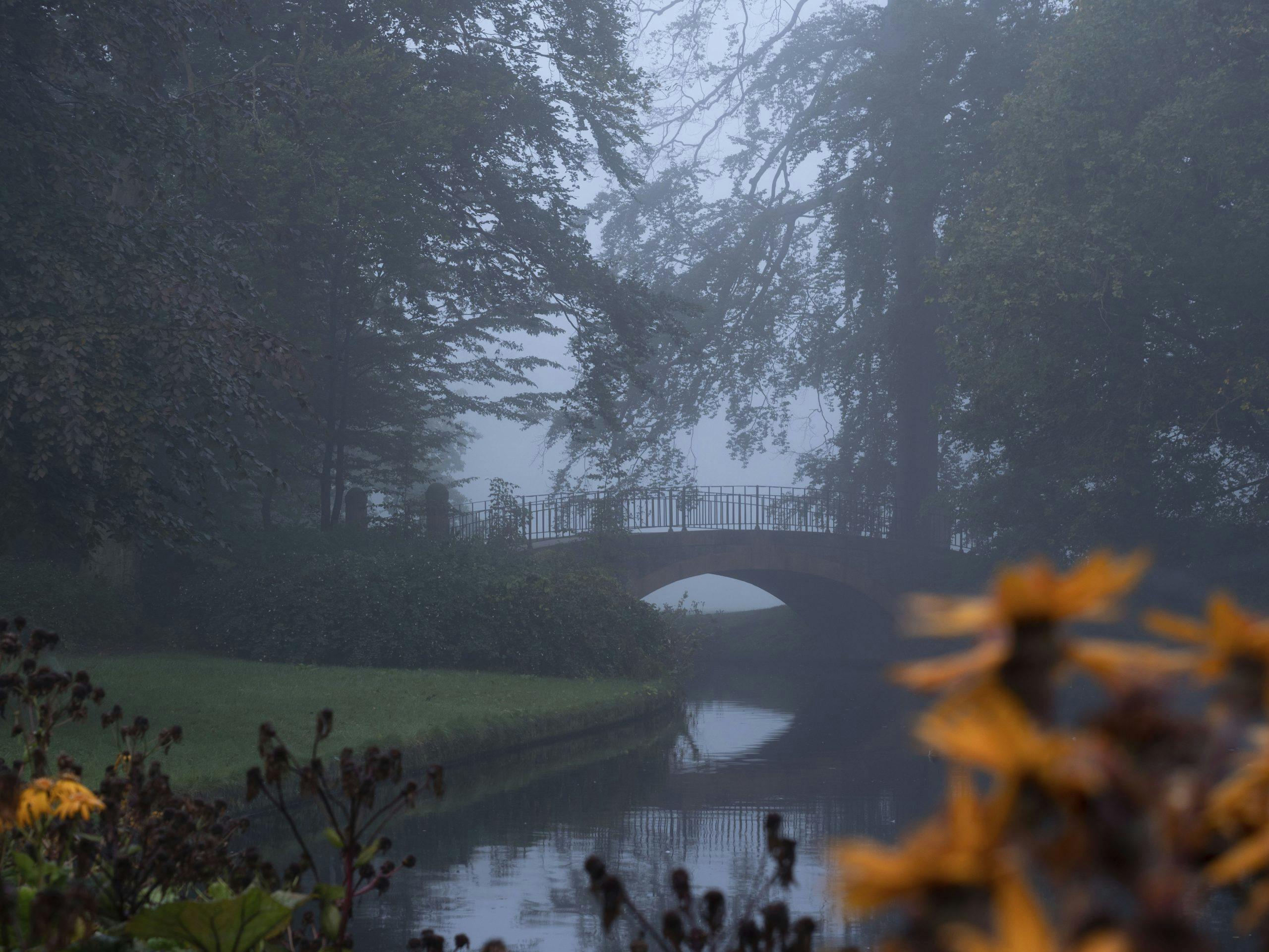 Vi gikk inn i parken og mot en bekk med en vakker bro over. Vi gikk ned på kne for å fange den stemningsfulle scenen, men tåken gjorde bildet litt flatt og endimensjonalt. For å skape dybde og fargespill i bildet vårt lot vi høstgule blomster stå i forgrunnen. Vi satte blenderåpningen til maksimale F2.8 for å gjøre blomstene uskarpe, slik at broen forble det sentrale i bildet.
