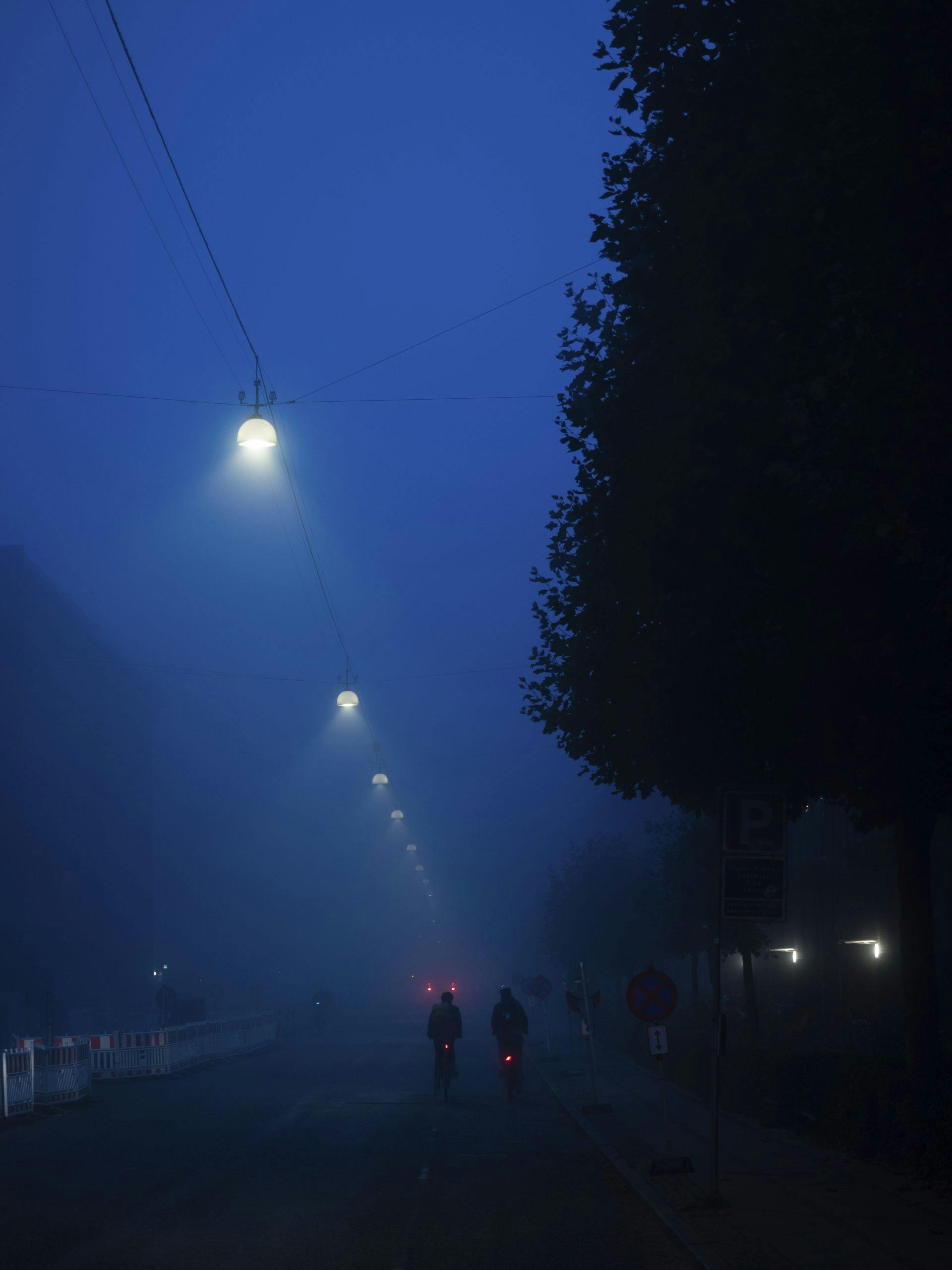 Solen hadde ennå ikke stått helt opp da vi satte oss på syklene våre. Byens gater var innhyllet i et mørkt slør som billysene og gatelysene så vidt trengte gjennom med diffuse sirkler. Dette var et vakkert syn, som om det var tatt ut av en dystopisk science fiction-film.