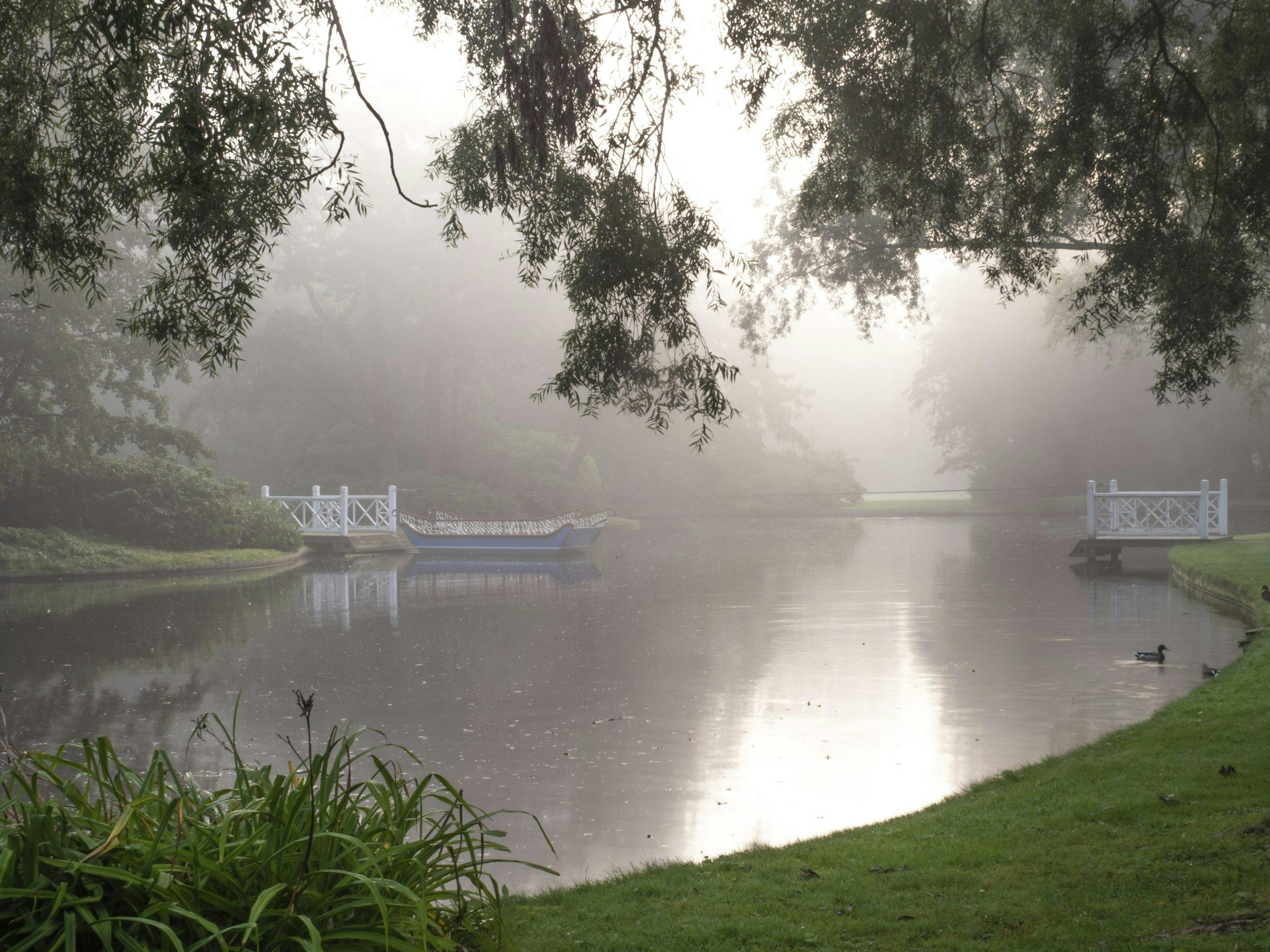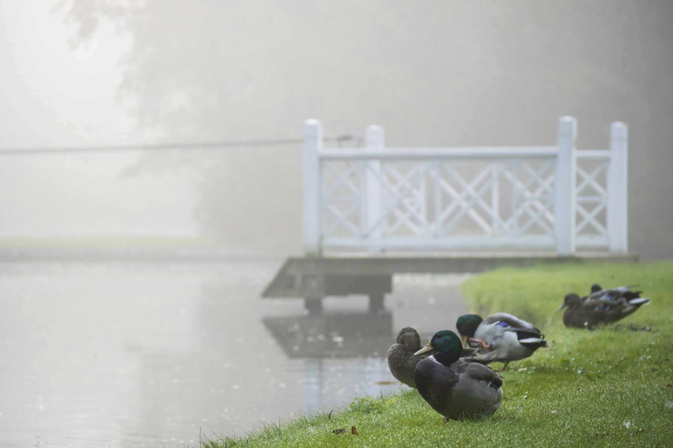 En flokk stokkender nøt den rolige morgenen, og det var bare de mest morgenspreke joggerne som forstyrret ferden deres. Endenes plasking i vannet skapte skarpe krusninger som sto i kontrast til det rolige, tåkete landskapet. Så vi tok stativet i bruk. Med kameraet plassert på stativet kunne vi bruke lang lukkertid til å jevne ut vannet. Dette krevde at vi måtte gjøre blenderåpningen mindre, ellers ville bildet bli overeksponert. Vi satte blenderåpningen til F22 og stilte først inn lukkertiden til 1,3 sekunder, men de lekne endene ble uskarpe på grunn av bevegelsene sine, så vi måtte redusere den til 0,5 sekunder. Dette ga oss et rolig motiv, og den lange lukkertiden bidro også til å fremheve tåkens diffuse effekt.