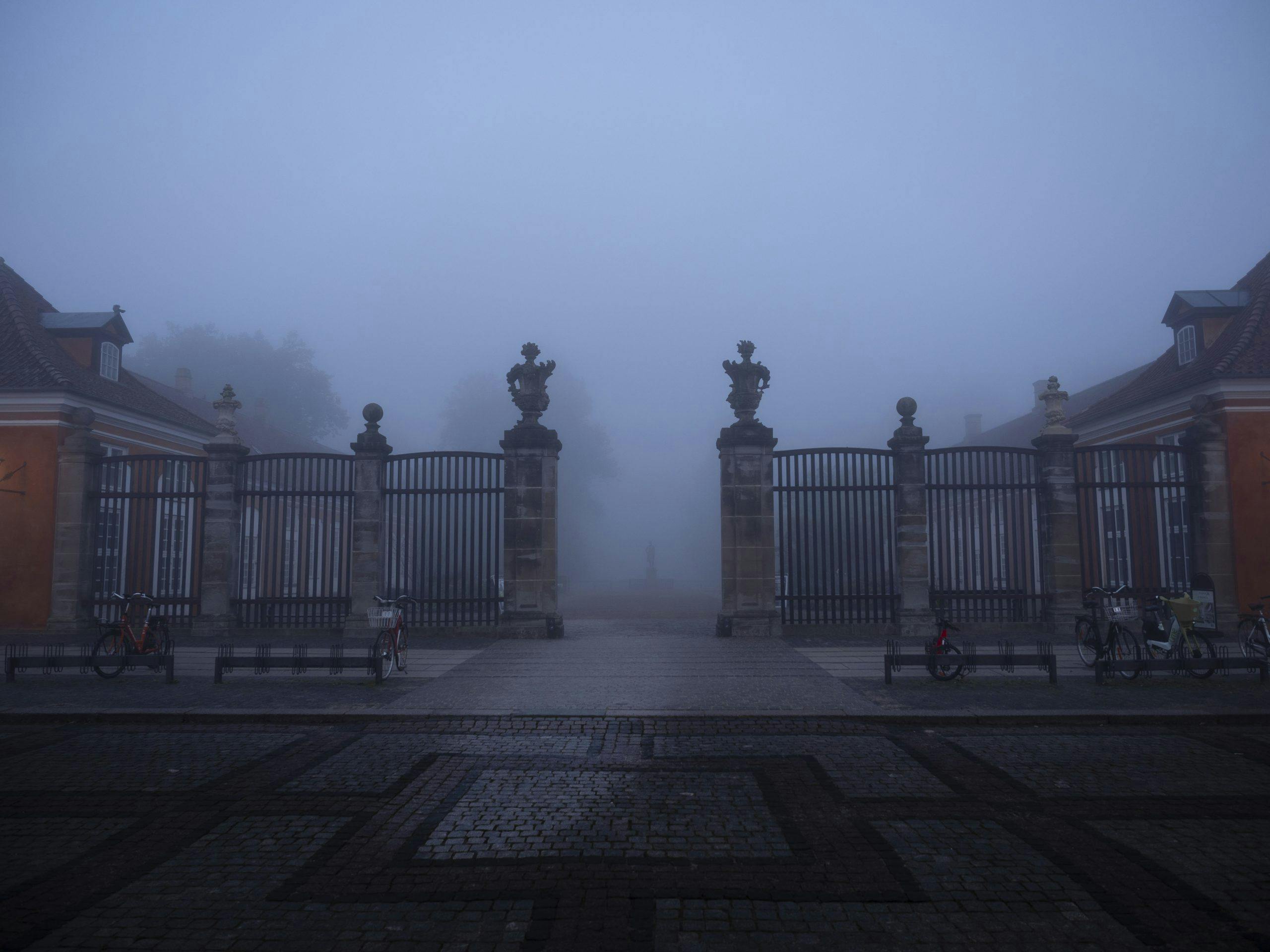 Etter en kort sykkeltur ankom vi parken. Ved inngangen ble vi møtt av en tåke som var så tykk at den skapte en vegg det nesten var umulig å se gjennom. Dette var et godt tegn. Vi tok et bilde av porten. For å komponere motivet symmetrisk brukte vi kameraets rutenettfunksjon. Da vi senere redigerte bildet vårt, dempet vi fargene på de parkerte syklene for å gjøre motivet roligere.