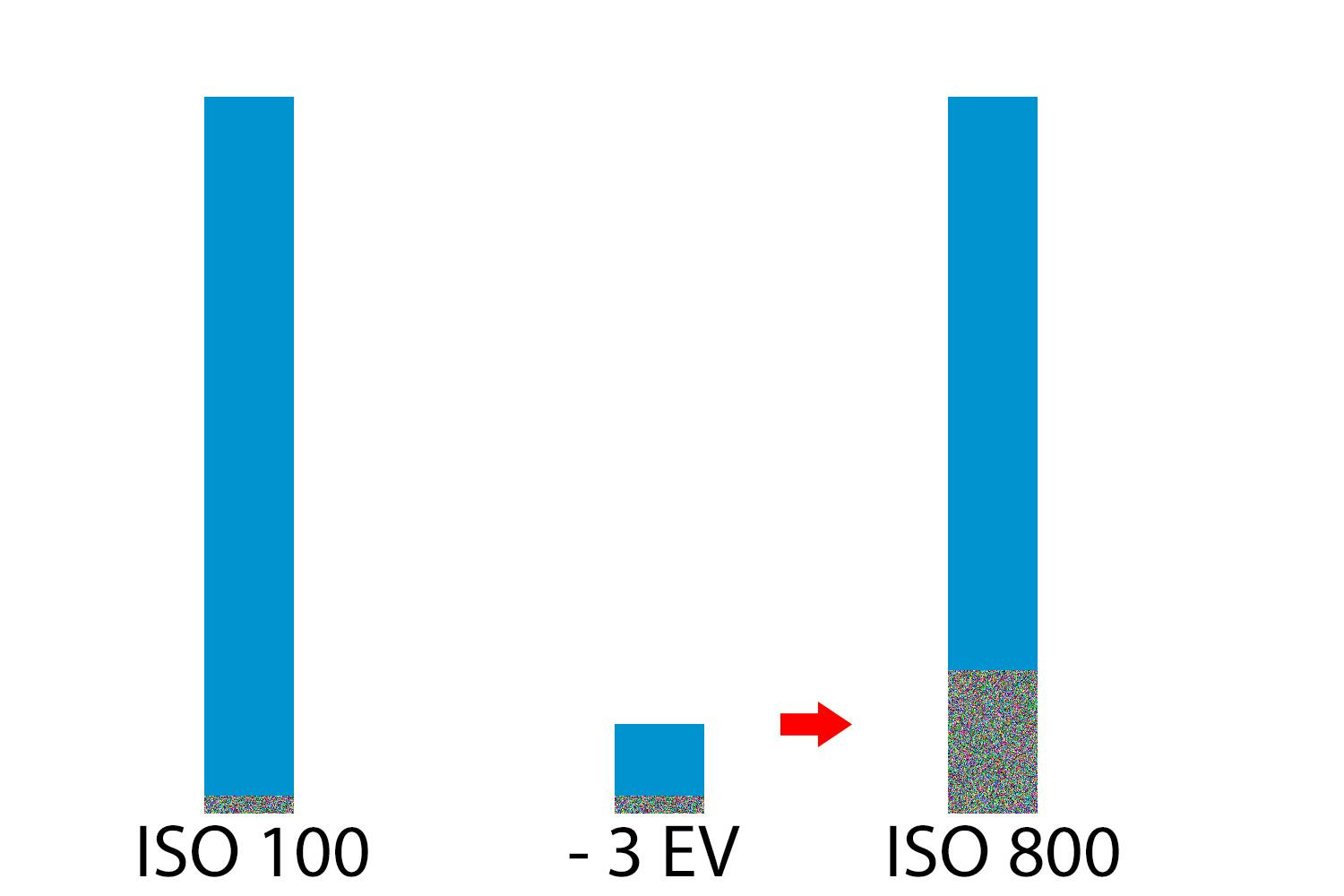 På ISO 100 er det rikelig med lys, som her er vist i blått, slik at lyset overdøver støyen. Når du velger ISO 800, er eksponeringen (EV) tre trinn mindre, men støyen tar like mye plass. På høy ISO-verdi forsterkes begge deler for å gi samme lys som på ISO 100, og da tar støyen mer plass.