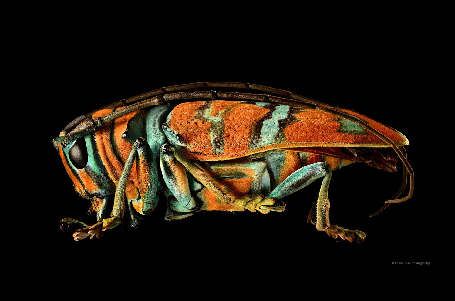 Levon Biss har kameraet montert på et elektronisk stativ, som han kan programmere til å ta bilder med 10 mikrometers (0,01 mm) mellomrom. Til sammenligning er et menneskehår omkring 75 mikrometer bredt.