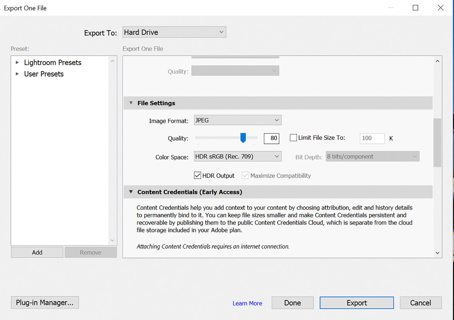 Hvis du vil bruke de ekte HDR-bildene dine i andre programmer som kan vise HDR, eller vise dem frem på mobilen eller i sosiale medier, må du eksportere dem fra Lightroom. Her har du noen spesifikke ting du må være oppmerksom på når du lagrer fra programmet.