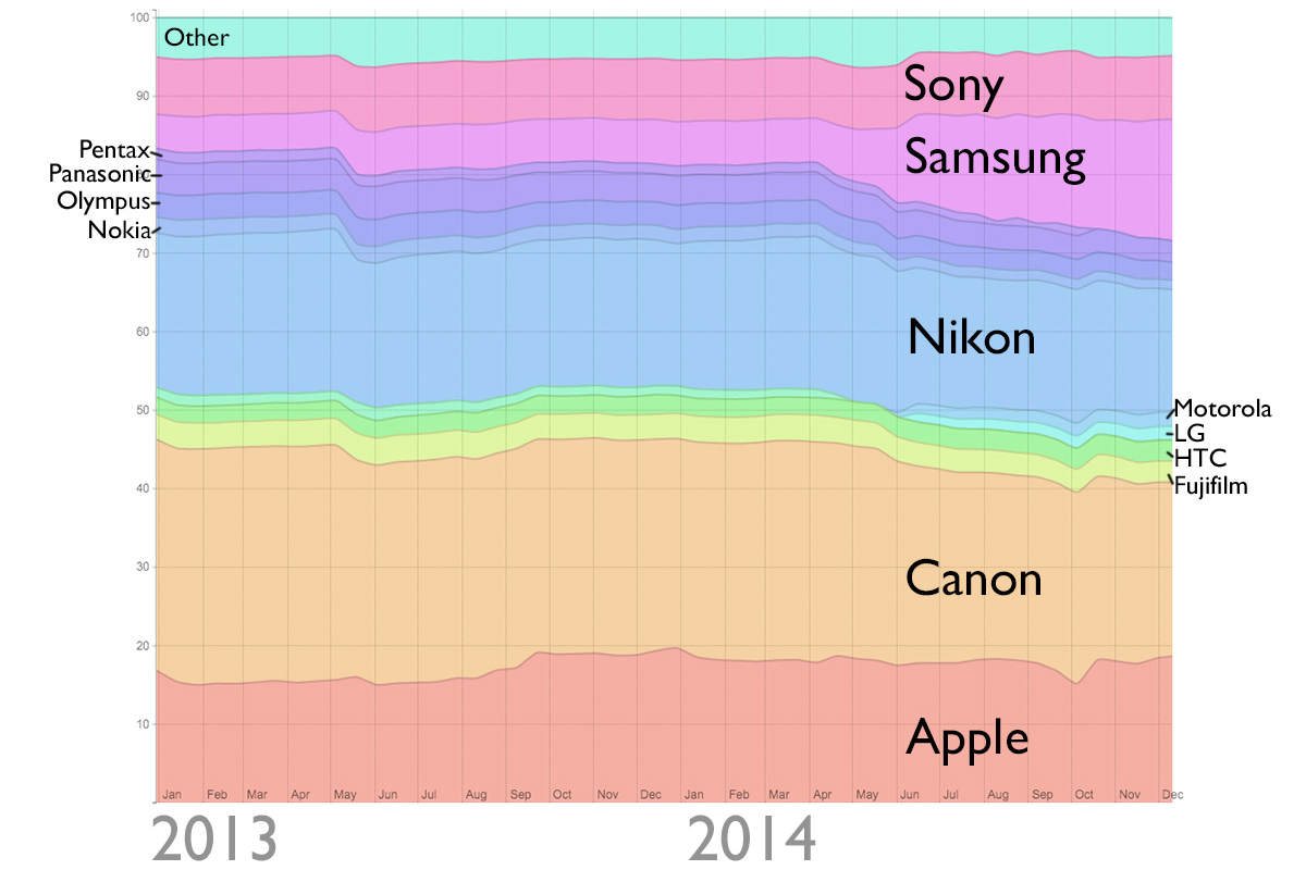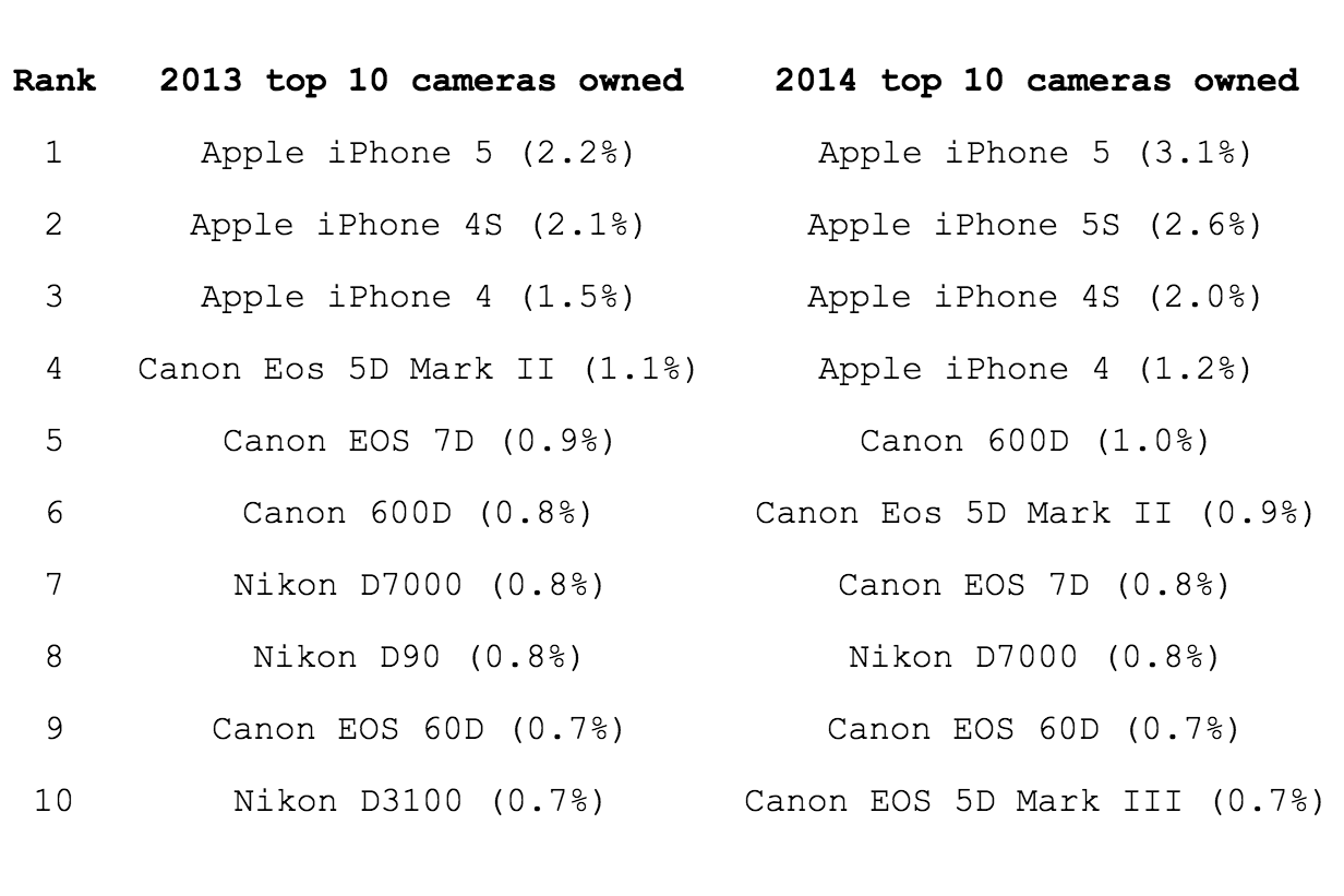 Canon sitter tungt på førsteplassen ved å ha 13 prosent av bildene på websiden i 2013 og 13,4 prosent i 2014.