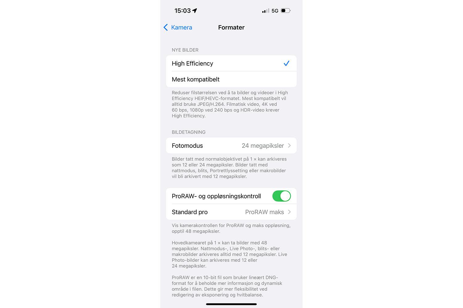 Med raw-formatet får du optimale forhold for bilderedigering. På iPhone aktiverer du raw ved å velge Innstillinger, Kamera og Formater. Slå på ProRAW- og oppløsningskontroll, og velg ProRAW maks ved Standard pro. I kameraappen kan du deretter trykke på RAW maks øverst for å slå råformat av og på når du tar et bilde.