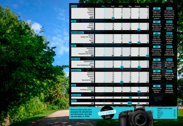 Det andre er Nikon Z 50, som plasserer seg jevnt flott i poengskalaen uten å være aller best i noen kategori – bortsett fra prisen. Men det gjenspeiler egentlig bare at Nikon Z 50 er et helstøpt kamera som leverer bra på alle områder og til en veldig god pris. Derfor ender Nikon Z 50 opp som testvinner. Hadde Sony prioritert skjermkvalitet og ergonomi høyere, ville dette kameraet fått tittelen. Hvis vi bare ser på bildekvalitet, legger Fujifilm seg marginalt foran Sony, men Fujifilm taper terreng på flere viktige områder, og i tillegg er det dyrest. Canon sliter med å holde følge i de fleste disiplinene, men utmerker seg med en veldig god skjerm og testens laveste pris.